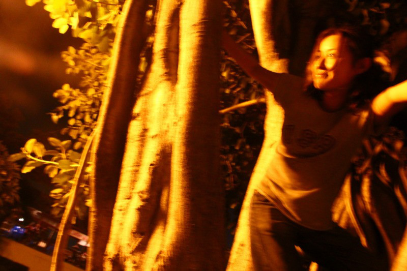 チャオプラヤーの川沿いで酔っ払って、木登りする華。