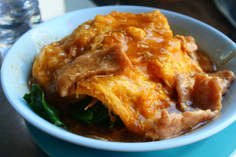 全体を覆うように被さる玉子を崩すと中から麺が出てくる。餡と玉子とこの麺が絶妙に絡まり、そこにしっとり柔らかい豚肉とシャキシャキの空芯菜が重なる。相変わらず、たまらない一品だった。